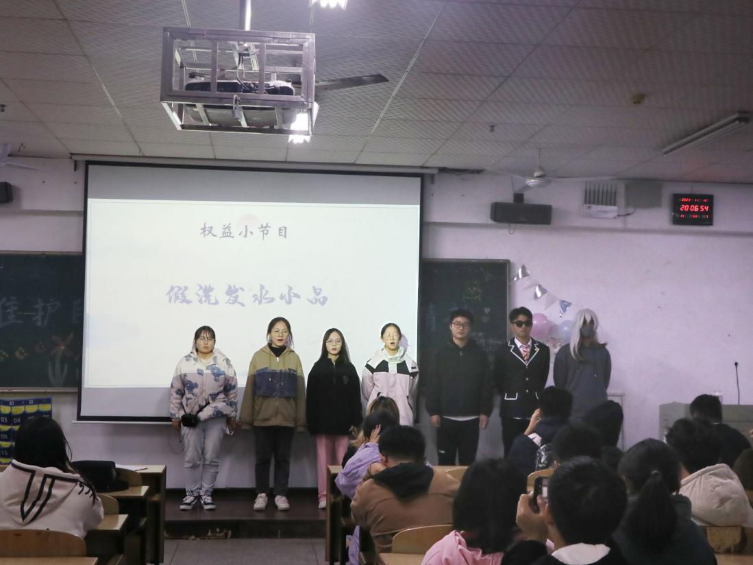 在主持人宣布活动正式开始后,第一位主讲人马起和通过维权相关视频引入话题。在强调维权的重要性和必要性后,他还仔细说明了维权部门、老员工常见权益以及直播带货中消费者维权这三部分内容。此后的维权小品《假洗发水》也客观生动地展现现实生活中存在的黑心商家卖给消费者假货、残次品的问题。刘伍帅根据缺乏证据、强势对手、时间和精力成本高这三个方面的问题就如何运用知识维护权益展开发言,其间运用具体事例给观众科普了相关法律知识,介绍了一些维权方法。最后,刘美玲讲述了为什么要维权以及正确维权的方式。她强调:“要树立维权意识,积极保障自己的基本权益,使自己的权益不受侵犯。”