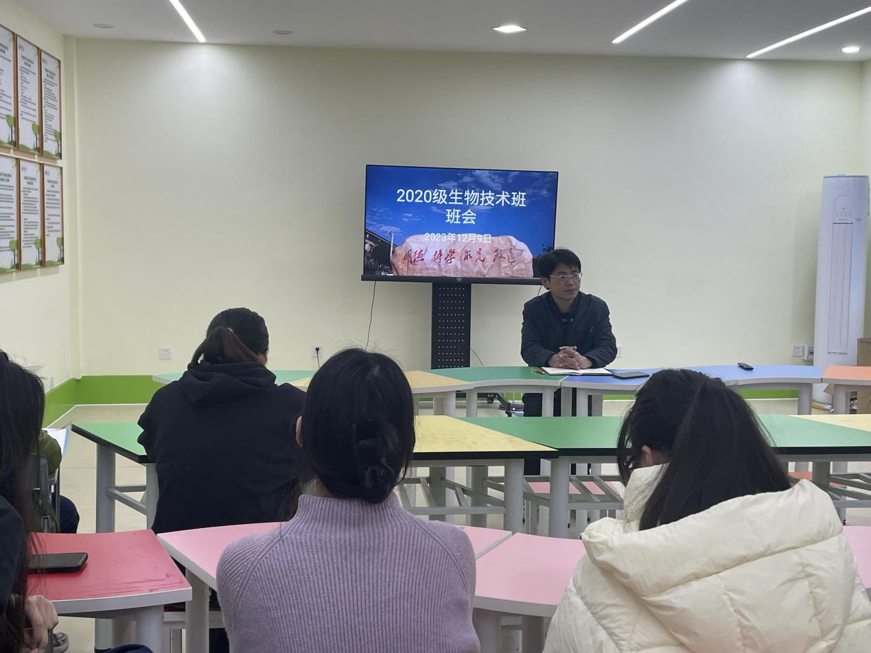 2023年12月9日晚,基础医公司20级生物技术01班在公司成长辅导室召开了一次紧凑但意义深远的班会。辅导员周玉林和班主任唐旻出席并讲话,全体生物技术班同学参加。