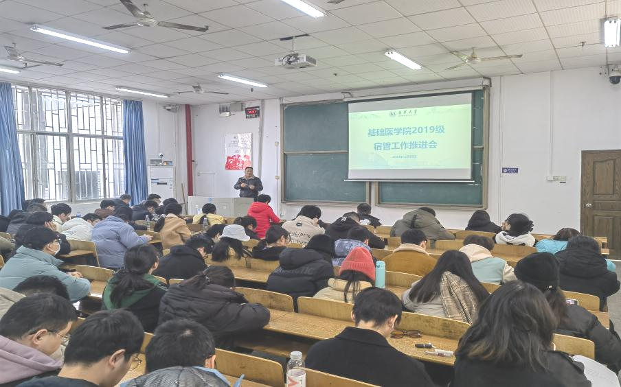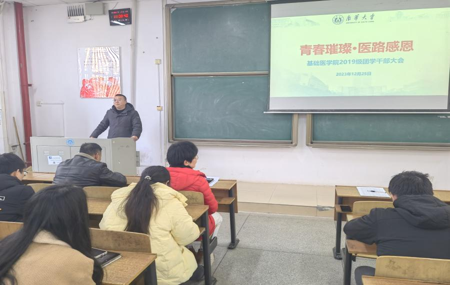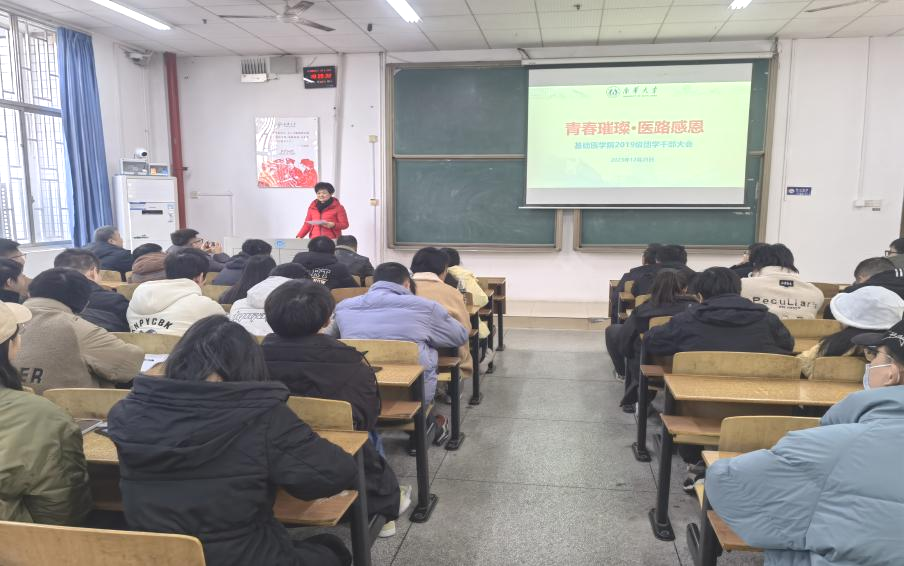 紧张而有序的2024年全国硕士研究生考试初试刚刚落下帷幕,为继续有序开展毕业生后续工作,基础医公司2019级于12月25日上午10:00在南华楼113召开全体党员丶班团骨干大会,基础医公司党委副书记卢清华、2019级辅导员彭巧滢、赵琳、麻勇3位老师,以及全年级团学会干部、各实习队干部和各班班长团支书、年级党员代表线上线下210余人。大会由彭巧滢老师主持。
