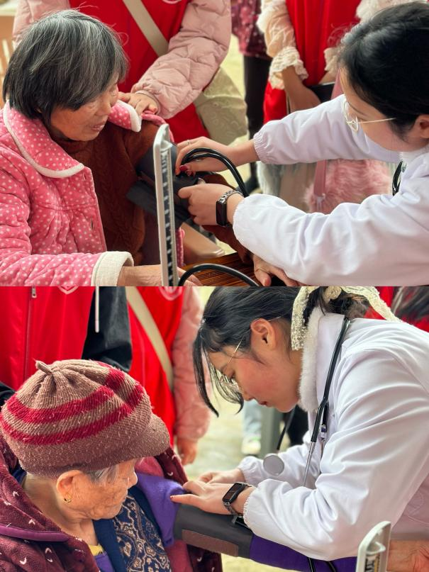 志愿者们来到敬老院,与老人们亲切谈心,关心老人的身体情况,来自附属医院的研究生志愿者们贴心的帮老⼈们测量⾎压,告知老⼈的健康状况,并给出了一些健康生活的小建议,让青年志愿服务切实走到老年人的身边。