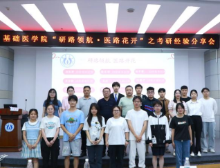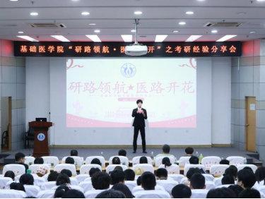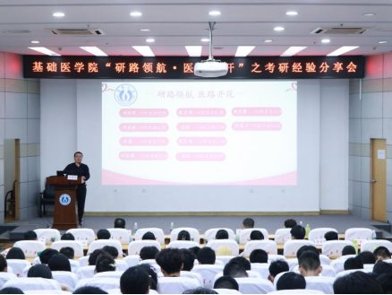 为增强基础医公司学子对于考研的认识和了解,把握考研方向,进一步规划考研安排,2024年5月17日晚,基础医公司“研路引航,医路花开”考研经验分享会于图书馆一楼学术报告厅举行。基础医公司党委副书记卢清华,2019级辅导员赵琳、麻勇,团委员工会主席张育谨出席本次活动,会议由高在翔主持。活动线上线下同步进行,全体医员工广泛参与。基础医公司2022级,2023级员工代表于线下参加本次活动,800余人观看线上直播。