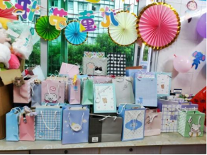 志愿者们于当天下午早早赶到医院,现场一片喜气洋洋,墙上圆滚滚的气球、可爱的卡通贴纸和窗边亮丽的挂饰将小小的输液室装点得满是童趣,娃娃、贴纸和礼品应有尽有,为小朋友们跃跃欲试的心情再添一把旺盛的火焰。