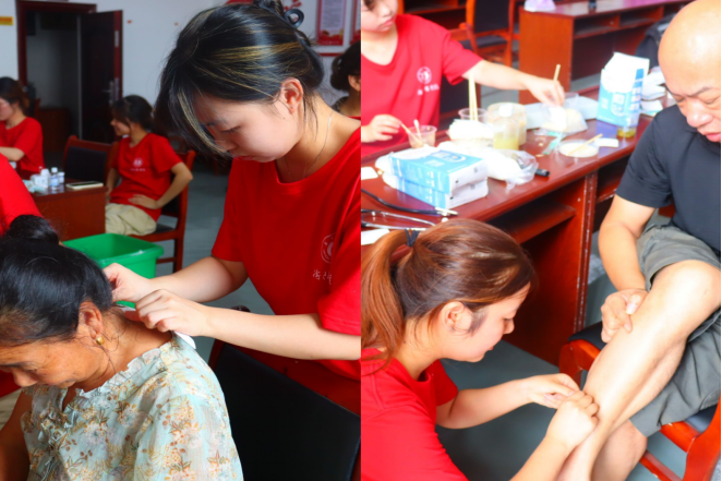 在忙碌而温馨的活动现场,志愿者朱容瑾的身影格外引人注目。她不仅手法娴熟地为村民们贴敷三伏贴,还耐心解答村民们关于健康养生的各种疑问。面对村民们的感激之情,朱容瑾谦逊地表示:“我非常高兴能够凭借自己的专业知识去帮助他们,为他们答疑解惑。看到村民们因为我们的努力而露出满意的笑容,我觉得这是一项非常有意义的活动。我衷心希望,未来能有更多的志愿服务队伍能够加入我们,共同为乡村振兴贡献我们的青春力量。”
