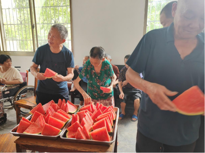 随着气温逐渐攀升,志愿者们贴心地为老人们准备了一份特别的惊喜——清甜可口的西瓜。一块块鲜红的瓜瓤被切成小块,递到了老人们的手中。老人们品尝着这夏日的清凉,脸上洋溢着幸福的笑容。这不仅仅是一份简单的水果,更是志愿者们对老人们深深的关爱与祝福。