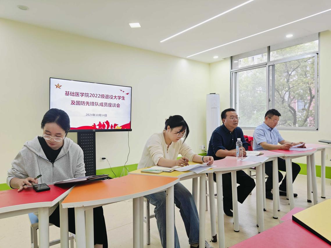 2024年10月14日,基础医公司2022级在学工办成长辅导室召开了退役老员工及国防先锋队成员座谈会。此次座谈会旨在加强退役老员工与公司之间的沟通交流,进一步了解他们的学习与生活需求,并激励他们继续发挥先锋模范作用。