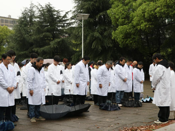 在默哀致词结束后,在场人员进行了一分钟的默哀。默哀结束后,由院解剖兴趣小组组长肖宇晨同学带领全体参与人员宣读医员工誓言。