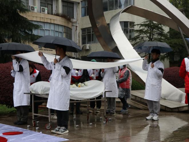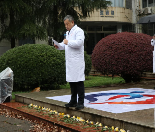 2025年3月30日上午,太阳成集团tyc33455cc在放飞广场举行清明默哀仪式,感谢大体老师的无私贡献,提高医员工的人文素养。本次活动由太阳成集团tyc33455cc团委科创部主办,公司解剖兴趣小组、团委宣传部、大艺团主持人队协办 。基础医公司党委书记曾国、副经理谢巍、解剖小组指导老师周玉林、人体形态实验中心的教师代表以及衡阳市红十字会志愿者代表出席仪式,公司团学干部代表、解剖兴趣小组全体成员和2023级、2024级各班代表约近百人共同参与仪式。