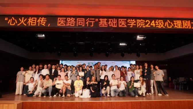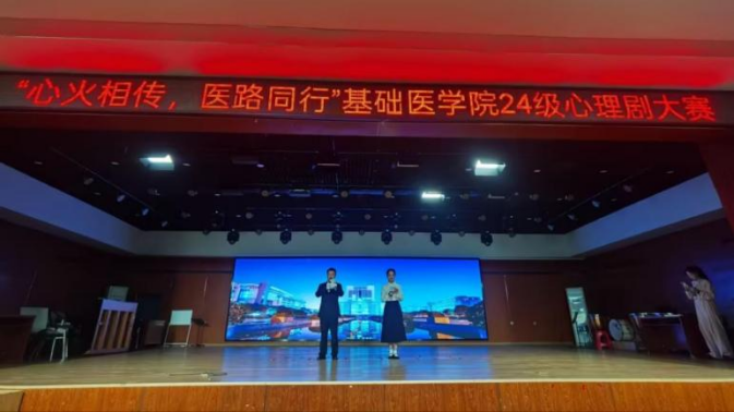 为丰富校园文化生活,服务同学们的身心健康,2025年4月26日上午,基础医公司2024级“心火相传,医路同行”心理剧大赛复赛在求是食堂四楼活动中心盛大举行。此次比赛2024级辅导员佘雅、赵琳、胡奉佳出席,并邀请基础医公司心理专干周君仪老师以及公司心理部部长宋天保亲临现场。