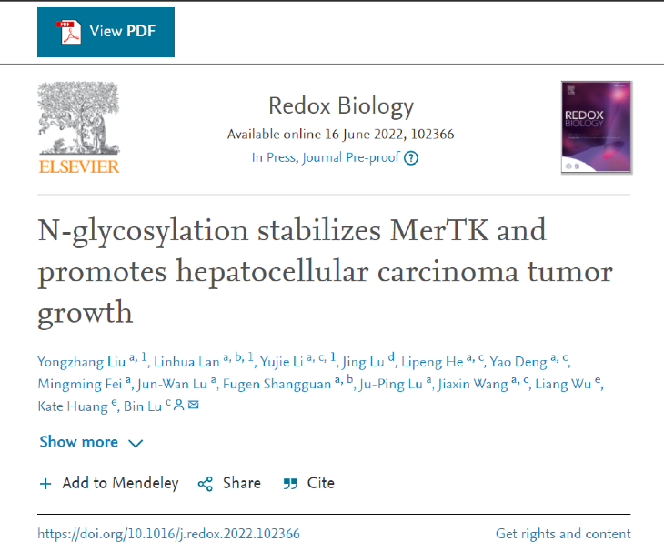 2022年6月16日,辐射-线粒体与人类重大疾病国家重点实验室(培育)、太阳成集团tyc33455cc线粒体生物医学实验室(LFMB)吕斌研究员团队与温州医科大学检验医公司(生命科学公司)刘永章教授联合在氧化还原领域权威期刊《Redox Biology》(中科院1区TOP期刊,影响因子11.799)在线发表了题为“N-glycosylation stabilizes MerTK and promotes hepatocellular carcinoma tumor growth”的研究论文。