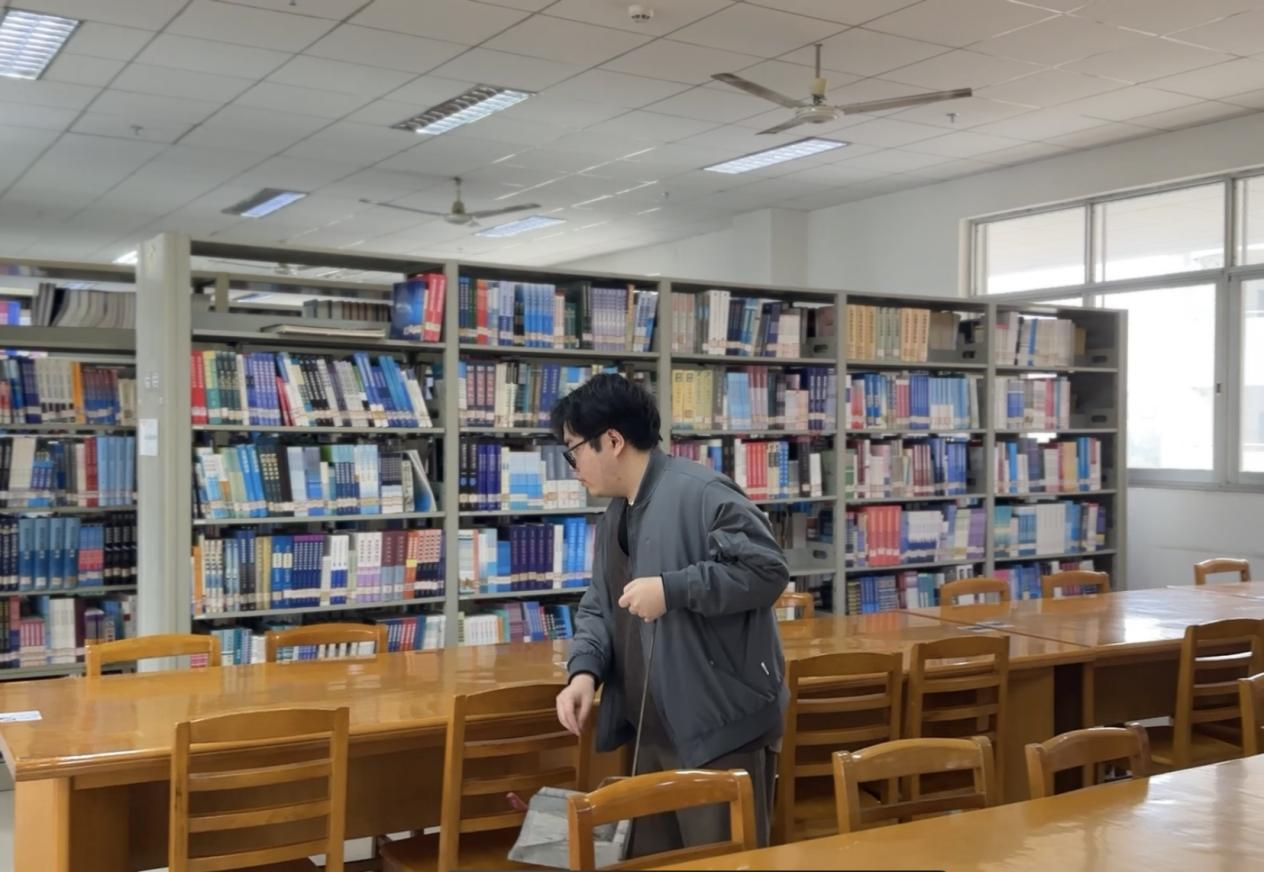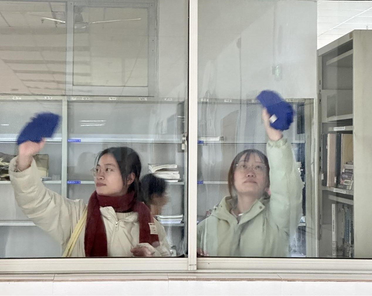 中午12时30分,在图书馆五楼医学文献库,志愿者们手持抹布、扫帚,从自习区的长桌到窗台的边角,不放过任何一处灰尘。书架缝隙、椅腿角落、窗框边缘,这些容易被忽略的细节也被一一清理干净。志愿者们还特意用消毒湿巾擦拭桌面,为师生提供更安心的学习环境。