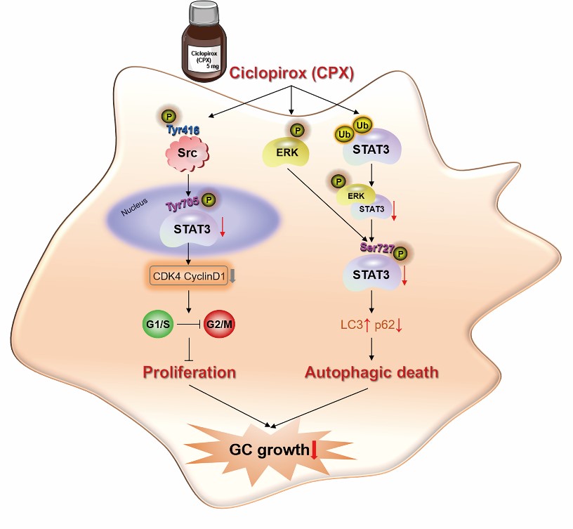 该研究通过体外和体内实验发现:一种用于临床的广谱抗真菌药环吡酮胺(ciclopirox, CPX)具有显著的抑制胃癌生长的作用。该研究发现CPX可以促进STAT3泛素化而被降解,进而抑制胃癌细胞增殖;该研究进一步发现CPX可以抑制胃癌细胞Src (Tyr416)磷酸化,从而使得STAT3(Tyr705)磷酸化水平下降,胃癌细胞周期阻滞在G1期,进而使胃癌细胞增殖受到抑制;该研究还发现,CPX可以促进胃癌细胞发生自噬性细胞死亡。该研究通过系统深入的细胞和动物水平实验,揭示了CPX抑制肿瘤细胞增殖和死亡的新机制。