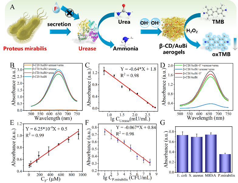 高致病菌的高灵敏和准确检测对于传染病的早期诊断和治疗,甚至对预防和控制传染病大流行至关重要。传统的细菌诊断技术(聚合酶链式反应(PCR)和酶联免疫吸附试验(ELISA)等)通常需要复杂冗长的操作过程,昂贵的大型分析仪器以及熟练的技术人员。因此,在尽可能短的时间内,高灵敏地检测和区分低浓度细菌,有利于预防严重感染及细菌流行病,从而避免对社会健康造成巨大不利影响。文中报道了一种β-环糊精/AuBi气凝胶,其具有高效的过氧化物酶样活性。AuBi气凝胶表面修饰的β-环糊精具有疏水空腔和亲水表面,可以有效地吸附足够的底物以产生主客体复合物,并增强AuBi气凝胶纳米酶的分散性和稳定性,从而提升类过氧化物酶样活性。结果表明,在TMB/H2O2体系中,β-环糊精/AuBi气凝胶的类酶活性明显优于纯AuBi气凝胶。利用脲酶催化尿素水解反应中pH值的变化来灵敏调节β-环糊精/AuBi气凝胶的类酶活性,从而实现对脲酶活性,脲酶阳性菌(奇异变形杆菌)以及氟离子(脲酶活性抑制剂)的可靠检测。值得注意的是,所构建的传感平台不仅可以满足在尿液中奇异变形杆菌临床检测标准,还能在短时间内实现高灵敏度的检测(LOD = 4 CFU/mL)。这项工作为设计用于检测病原体的高性能纳米酶开辟了新的途径。
