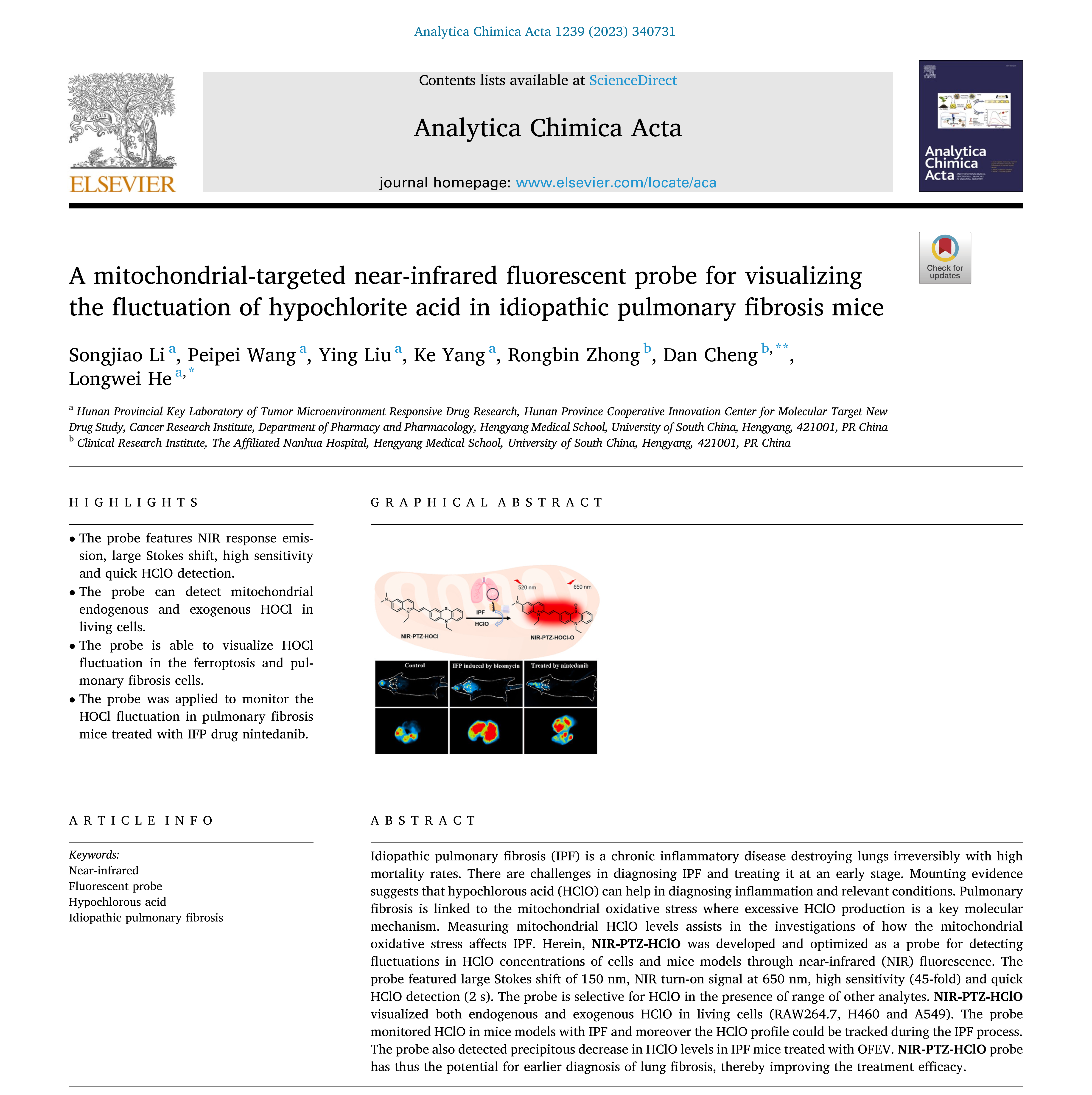 成果五:A mitochondrial-targeted near-infrared fluorescent probe for visualizing the fluctuation of hypochlorite acid in idiopathic pulmonary fibrosis mice