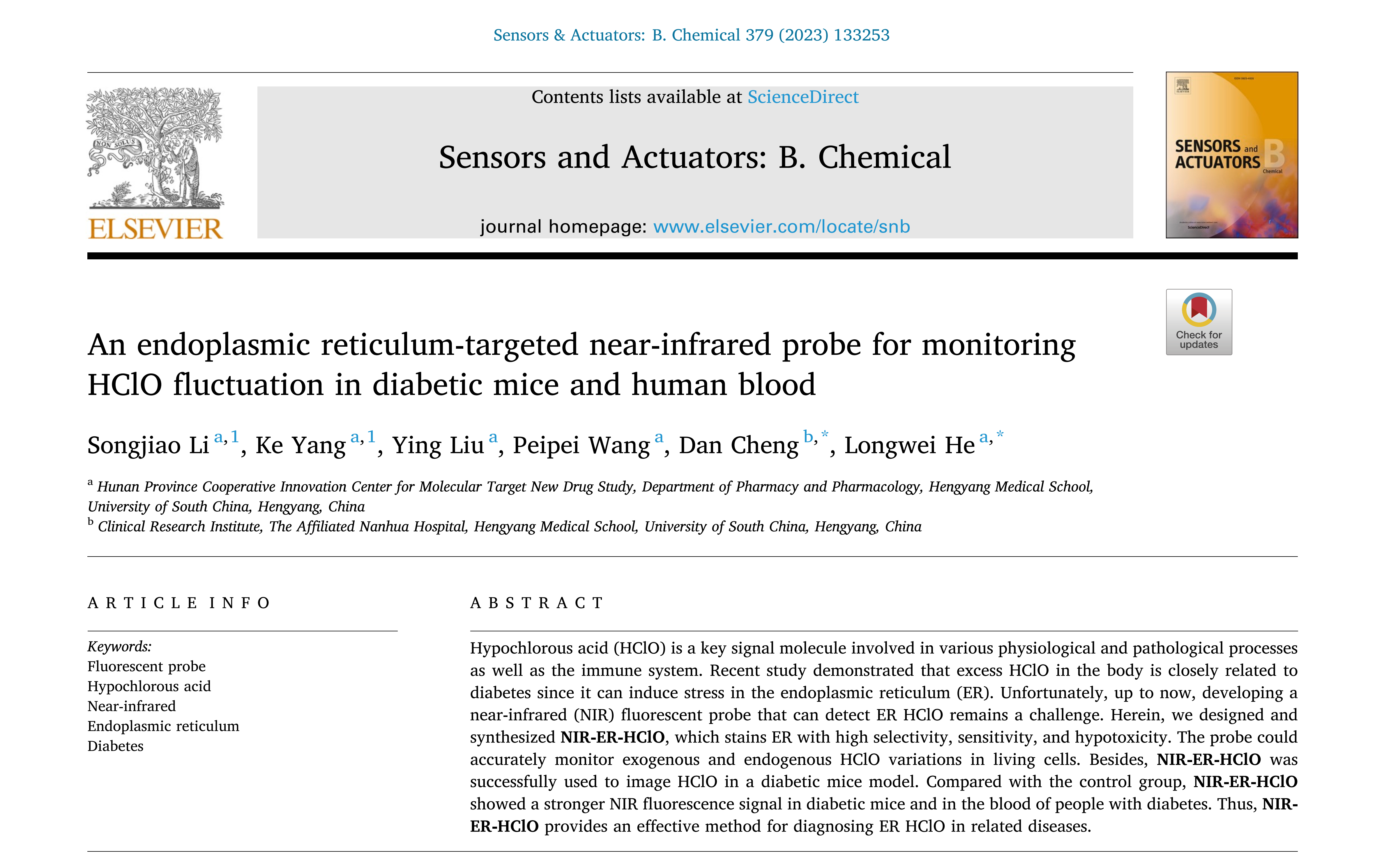 次氯酸(HClO)是一种参与各种生理和病理过程以及免疫系统的关键信号分子。最近的一项研究表明,体内过量的次氯酸与糖尿病密切相关,因为它可以诱发内质网的压力。到目前为止,开发能够检测内质网次氯酸的近红外荧光探针仍然是一个挑战。因此,本团队设计并合成了近红外荧光探针NIR-ER-HClO,它能以高选择性、高灵敏度和低毒性对内质网进行染色。该探针可以准确监测活细胞中外源性和内源性次氯酸的变化。此外,NIR-ER-HClO成功用于糖尿病小鼠模型中次氯酸成像。与对照组相比,NIR-ER-HClO在糖尿病小鼠和糖尿病患者的血液中显示了更强的近红外荧光信号。因此,NIR-ER-HClO为诊断糖尿病相关疾病提供了一种有效的方法。