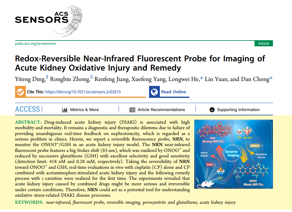 急性肾损伤(AKI)是一种临床危重疾病,表现为短时间内肾功能急速下降,可能在数周内致命,因此对急性肾损伤进行早期诊断及干预治疗,可防止其病情加重,降低死亡率。本研究报道了一种高特异性过氧化亚硝酸阴离子/谷光甘肽可逆近红外荧光探针。该探针能够靶向肾脏,首次实现了单独应用顺铂和顺铂联合对乙酰氨基酚所致急性肾损伤的实时评估以及治疗药物的初步疗效评估。实验表明,在一定条件下,联合用药所致的急性肾损伤可能更为严重且不可逆转。该探针可望作为一个潜在的工具来研究氧化应激相关的急性肾损伤进程。