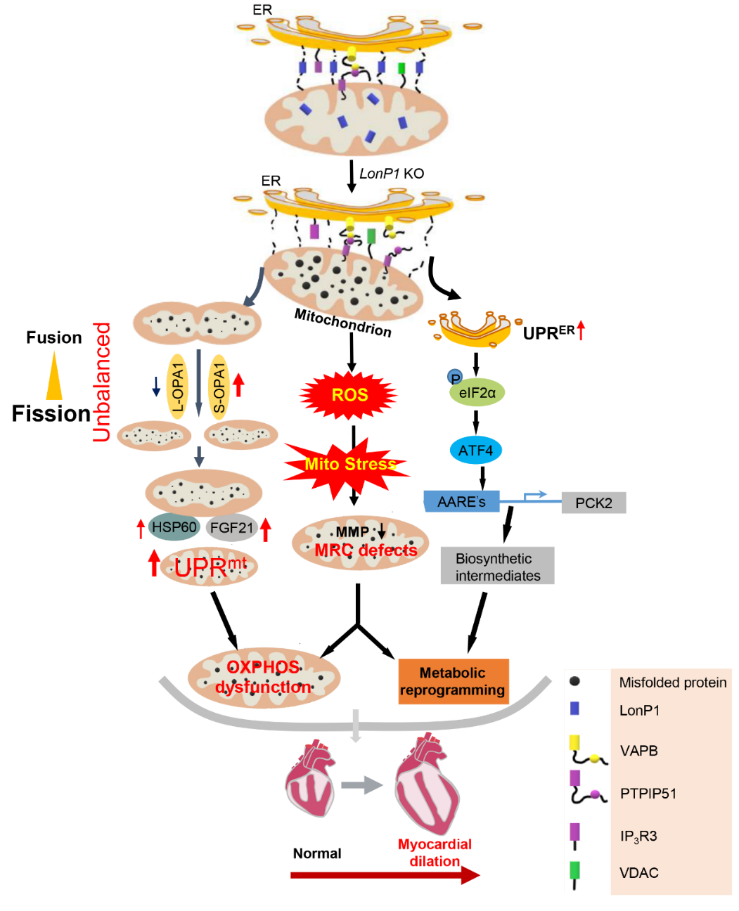 在前期研究中,该团队研究人员通过构建心肌细胞特异性敲除LonP1蛋白酶小鼠,发现LonP1蛋白酶也存在于MAM中,参与调控对线粒体和ER的互作,维持心肌细胞MAM完整性。小鼠心肌细胞缺失LonP1蛋白酶后,心肌细胞线粒体-ER互作明显减弱。小鼠心肌细胞缺失了LonP1蛋白酶后,线粒体融合-分裂动态变化出现异常,心肌细胞线粒体发生了明显的片段化。研究进一步发现一个有趣的现象:当小鼠心肌细胞中LonP1蛋白酶缺失时,可以同时激活细胞的UPRER以及UPRmt,但是UPRmt的激活反而要晚于UPRER的激活。接着,该团队研究人员通过透射电镜,BN-PAGE胶及蛋白质组学分析发现,心肌细胞特异性敲除LonP1蛋白酶后,导致心肌细胞线粒体形态异常,线粒体出现大量异常蛋白的聚集,呼吸链酶复合物的组装严重受损,导致线粒体复合物酶活性显著下降。研究人员随后发现:小鼠心肌细胞缺失了LonP1蛋白酶后,细胞通过代谢重编程,显著增加糖异生及氨基酸代谢相关基因,以应对由于LonP1蛋白酶缺失导致的心肌细胞线粒体氧化磷酸化障碍所导致的供能不足。最后,该研究发现:小鼠心肌细胞缺失了LonP1蛋白酶后,小鼠心脏发生重塑,进而表现为扩张型心肌病,最终导致小鼠因心衰而死亡,小鼠寿命显著缩短。
