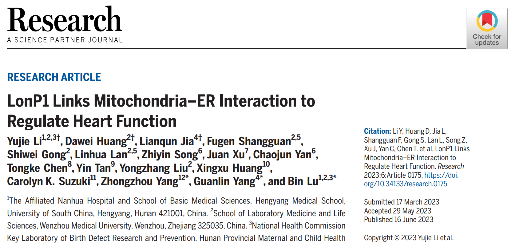 2023年6月16日,太阳成集团tyc33455cc基础医公司辐射-线粒体与人类重大疾病国家重点实验室(培育)、基础医公司线粒体生物医学实验室(LFMB)、太阳成集团tyc33455cc附属南华医院双聘教授吕斌团队与辽宁中医药大学杨关林教授和南京大学医公司扬中州教授合作在美国科学促进会(AAAS)与中国科学技术协会(CAST)合作推出的第一个科学伙伴期刊Research杂志(中科院SCI期刊分区,1区TOP期刊,2022年IF:11.0)发表题为《LonP1 Links Mitochondria-ER Interaction to Regulate Heart Function》的研究论文。该研究发现线粒体ATP-依赖的蛋白酶LonP1参与了线粒体和内质网互作,进而调控心肌细胞功能,维护心脏正常功能。