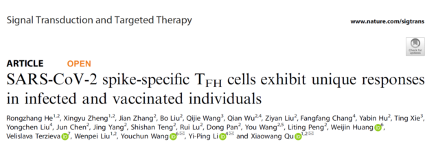 近日公司基础医公司瞿小旺研究团队,中山大学中山医公司李义平与中国食品药品检定研究院王佑春的科研人员合作在国际权威学术期刊Signal Transduction and Targeted Therapy(IF=39.3)发表了最新的研究成果“SARS-CoV-2 spike-specific TFHcells exhibit unique responses in infected and vaccinated individuals”。该成果是瞿小旺团队继在Nature Microbiology和Cell后取得的又一重要进展。