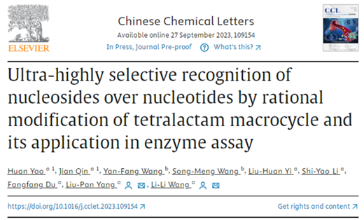 在水中高选择性的识别具有重要生物功能分子人工大环主体较为罕见。王力立/杨留攀课题组利用“边臂修饰”的策略设计合成了一种新的水溶性仿生四内酰胺大环,实现了对单磷酸核苷酸和相应核苷的超高选择性识别。通过在内官能化腔外围引入电荷辅助基团,使得鸟苷对5′-单磷酸鸟苷的选择性从100显著提高到1119。基于该大环的超高选择性识别能力,通过产物选择性荧光指示剂置换法实现了CD73酶活性的灵敏测定,并展示了该方法筛选抑制剂的能力。该研究成果发表于《中国化学快报》。论文的第一作者为王力立/杨留攀团队的博士后姚欢和硕士生秦戬,王力立教授与杨留攀教授为共同通讯作者。
