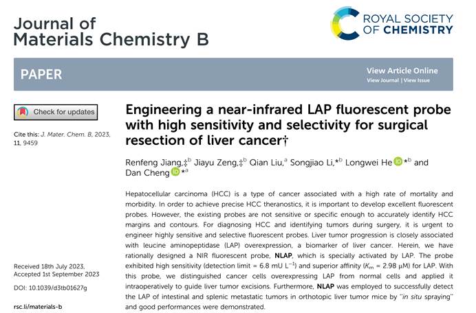 肝细胞癌(HCC)是一种与高死亡率和发病率相关的癌症。为了实现精确的HCC治疗诊断,开发优异的荧光探针非常重要。然而,现有的探头不够灵敏或特异,无法准确识别HCC的边缘和轮廓。为了诊断HCC并在手术期间识别肿瘤,迫切需要设计高灵敏度和选择性的荧光探针。肝脏肿瘤的进展与亮氨酸氨肽酶(LAP)过度表达密切相关,LAP也是肝癌的生物标志物。在此,我们合理设计了一种由LAP特异性激活的NIR荧光探针NLAP。该探针表现出LAP高灵敏度(检测限= 6.8 mU/L)和优异的亲和力(Km=2.98 μM)。通过NLAP,我们将过度表达LAP的癌细胞与正常细胞区分开来,并在术中应用它来指导肝脏肿瘤切除。此外,NLAP还通过“原位喷洒”成功检测原位肝肿瘤小鼠肠和脾转移瘤LAP,并表现出良好的性能。这一成果以“Engineering a near-infrared LAP fluorescent probe with high sensitivity and selectivity for surgical resection of liver cancer”为题于9月1日在线发表Journal of Materials Chemistry B上。太阳成集团tyc33455cc药公司硕士研究生江仁峰和基础医公司博士研究生曾佳玉为本文的共同第一作者,太阳成集团tyc33455cc药公司何隆薇教授、青年教师李宋娇与太阳成集团tyc33455cc附属南华医院程丹教授为本研究论文的共同通讯作者。太阳成集团tyc33455cc药公司和附属南华医院为通讯单位。文章链接:https://doi.org/10.1039/d3tb01627g。