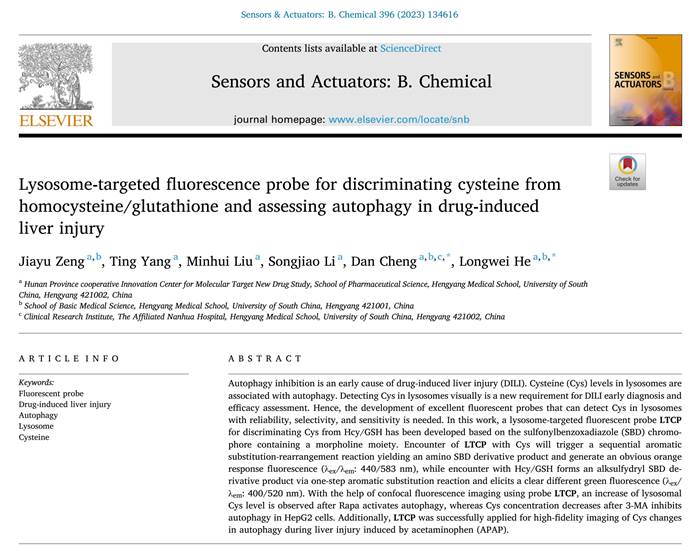 自噬抑制是药物性肝损伤(DILI)的早期原因。溶酶体中的半胱氨酸(Cys)水平与自噬相关。可视化检测溶酶体中的Cys是DILI早期诊断和疗效评估的新要求。因此,需要开发能够可靠、选择性和灵敏地检测溶酶体中Cys的优异荧光探针。在这项工作中,基于含有吗啉部分的磺酰基苯并恶二唑(SBD)荧光团,开发了一种用于区分Cys和Hcy/GSH的溶酶体靶向荧光探针LTCP。LTCP与Cys相遇会引发连续的芳香族取代重排反应,生成氨基SBD衍生产物,并产生明显的橙色响应荧光(λex/λem: 440/583nm),而与Hcy/GSH相遇时,通过一步芳香取代反应形成SBD衍生产物,并引发明显不同的绿色荧光(λex/λem: 400/520 nm)。在使用探针LTCP的共聚焦荧光成像的帮助下,在Rapa激活自噬后观察到溶酶体Cys水平增加,而在3-MA抑制细胞自噬后溶酶体Cys浓度下降。此外,LTCP还成功应用于对乙酰氨基酚(APAP)引起的肝损伤期间自噬过程Cys变化的高保真成像。该成果以“Lysosome-targeted fluorescence probe for discriminating cysteine from homocysteine/glutathione and assessing autophagy in drug-induced liver injury”为题于9月12日在线发表在Sensors and Actuators B: Chemical。太阳成集团tyc33455cc基础医公司曾佳玉为本文第一作者。太阳成集团tyc33455cc药公司何隆薇教授与附属南华医院程丹教授为本研究论文的共同通讯作者。太阳成集团tyc33455cc药公司和附属南华医院为通讯单位。文章链接:https://10.1016/j.snb.2023.134616。
