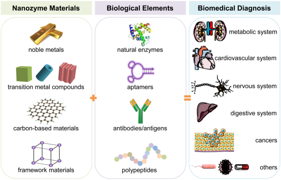 图2.纳米酶材料与生物元素结合赋能生物医学诊断(图片来自Advanced Healthcare Materials)