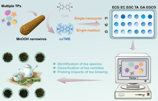 图1.单纳米酶单信号读取传感器阵列赋能茶多酚高效鉴别(图片来自Food Chemistry)。