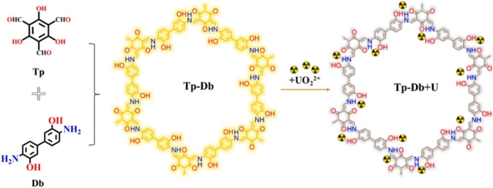 本研究以解决偕胺肟基团后修饰复杂以及存在钒离子干扰为导向,对COF的连接方式以及官能团进行了精心设计。通过1,3,5-三甲酰基间苯三酚(Tp)和3,3'-二羟基联苯胺(Db)的简单一步缩合反应,合成了一种β-酮烯胺连接的COF荧光探针(Tp-Db)。Tp-Db对UO22+的检测限为99.34 nM,反应时间为10s,适用于河流水、核废水、食品和尿液等多种环境样品中的快速检测。实验分析和密度泛函理论(DFT)计算表明,UO22+通过分子内电荷转移和静电作用优先与Tp-Db中的羰基配位。同时与Tp-BD对比,Tp-Db中羟基辅助基团的引入进一步提高了与UO22+结合亲和力,从而实现对UO22+检测的高选择性和高灵敏度。本研究阐明了β-酮烯胺连接的COF通道中不同官能团(羰基、羟基和亚胺)与UO22+的相互作用机制,为开发具有精确原子结构的高效COFs荧光传感器用于UO22+检测提供了重要参考价值。
