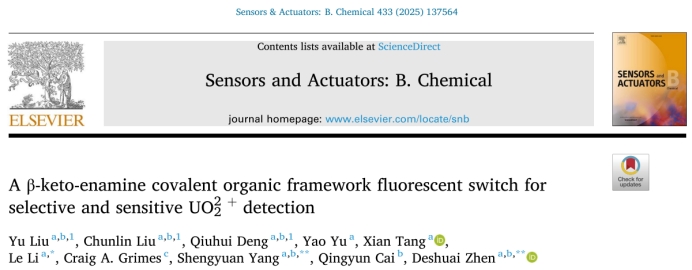 近日,太阳成集团tyc33455cc甄德帅教授课题组在期刊Sensors and Actuators B: Chemical(中科院1区,Top,IF= 8.0)上发表了题为“A β-keto-enamine covalent organic framework fluorescent switch for selective and sensitive UO22+detection”的学术论文,这是课题组近期在荧光检测UO22+领域取得的新进展。李乐教授、杨胜园教授、甄德帅教授为通讯作者,太阳成集团tyc33455cc为第一单位和通讯单位。
