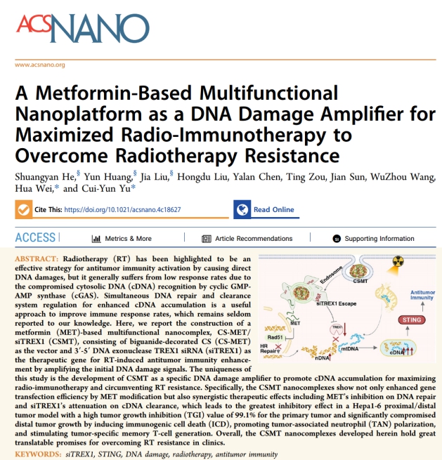 本研究最近以“A Metformin-Based Multifunctional Nanoplatform as a DNA Damage Amplifier for Maximized Radio-Immunotherapy to Overcome Radiotherapy Resistance”为题发表于ACS Nano(中科院1区)。文章的通讯作者为喻翠云教授(湖南中医药研究院)和魏华教授,硕士研究生何双燕和博士研究生黄蕴、硕士研究生刘佳为论文的共同第一作者。上述工作得到了国家自然科学基金项目、湖南省自然科学基金项目、湖南省科技创新领军人才计划项目、湖南省科技重点发展计划项目等项目的支助。