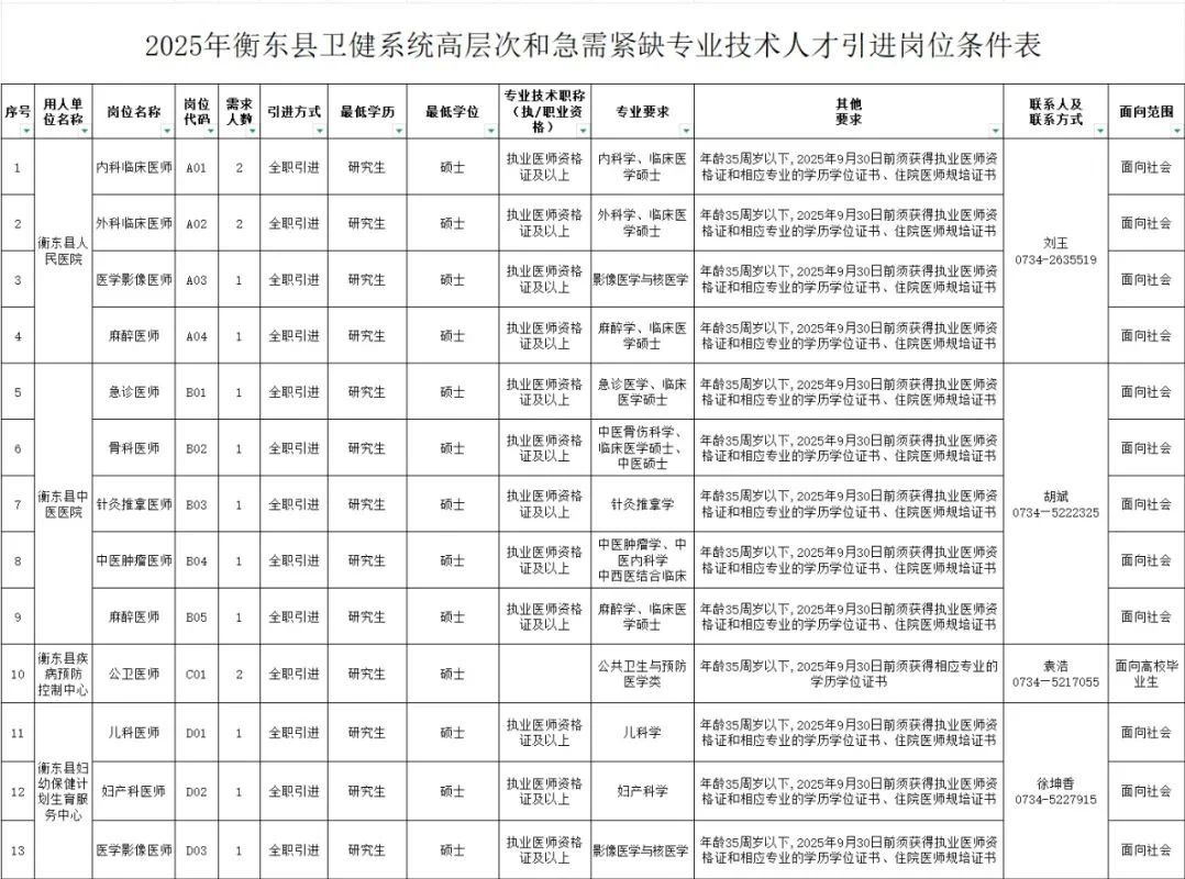 根据《事业单位人事管理条例》(国务院令第652号)《湖南省事业单位公开招聘人员办法》(湘人社规〔2025〕1号)及《衡东县“十四五”人才行动规划》(东发〔2023〕11号)《衡东县县属企事业单位人才引进实施办法》,经研究,衡东县卫健系统决定面向社会公开引进一批高层次和急需紧缺专业技术人才,现公告如下。