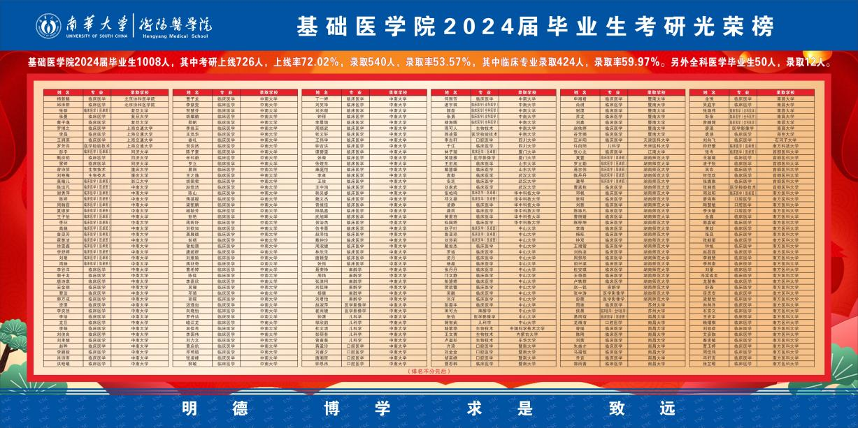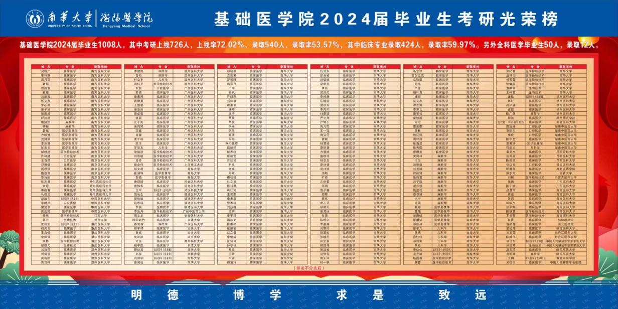 基础医公司2024届非定向毕业生1008人,其中考研上线726人,上线率72.02%,录取540人,录取率53.57%,其中临床专业录取424人,录取率59.97%;另外全科定向毕业生50人,录取12人。