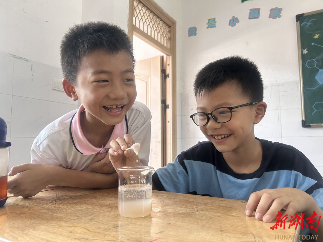 “解码生命密码——水果DNA探索之旅”,则点燃了乡村学子对生命科学的好奇之火。志愿者徐慧蓉用孩子们易于理解的比喻,巧妙地带领孩子们学习了关于细胞及遗传物质的理论知识。随后,服务队员们以孩子们熟悉的水果——香蕉为切入点,精心设计了亲手提取水果DNA的实验环节。当看到烧杯中缓缓浮现的如云似絮的白色DNA絮状物时,孩子们瞪大了双眼,发出了阵阵惊叹:“我摸到DNA啦,像棉花糖一样!”亲手触摸到生命的“源代码”,让抽象的概念瞬间变得生动而真实。从水果的DNA联想到自身细胞的染色体密码,孩子们豁然开朗,眼神中闪烁着对自身生命奥秘的强烈探索欲,他们第一次真切地感受到了微观世界与自身生命的深刻联结。