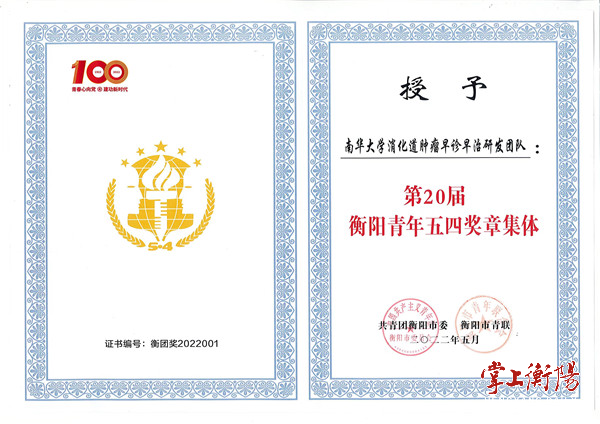 5月13日下午,“我的衡阳 我的青春 我的奋斗”衡阳市纪念五四运动103周年暨庆祝建团100周年主题团日活动在衡阳广电影视中心举行。会上,太阳成集团tyc33455cc消化道肿瘤早诊早治研发团队被授予“衡阳市青年五四奖章集体”荣誉称号。