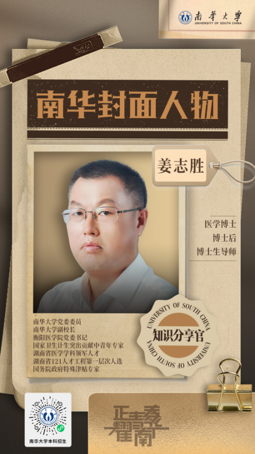 姜志胜教授长期从事动脉粥样硬化病因发病学以及心肌缺血损伤的细胞分子机制与防治研究,是国家卫生计生突出贡献中青年专家,教育部基础医学类教指委委员,湖南省自然科学一等奖获得者,动脉硬化学湖南省重点实验室主任,湖南省医学学科领军人才。由他主编的《病理生理学》第三版规划教材于2021年荣获首届全国教材建设奖全国优秀教材二等奖。面对2020年突发的新冠疫情,姜志胜教授担任湖南省总领队兼方舱医院经理,不惧风险、担当奉献,投身抗疫一线,以优异的成绩抗疫归来。