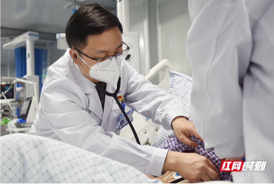 主治医师谭位华(左二)正忙着查看一位重症患者。