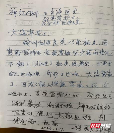 “王医生也咳,邹护士也咳,大家都病了,可为了病人健康,大家迎难而上,真是医者仁心。”因新冠入院的刘爷爷康复出院时,默默留下感谢信,信中为敬业的神内医务人员点赞。
