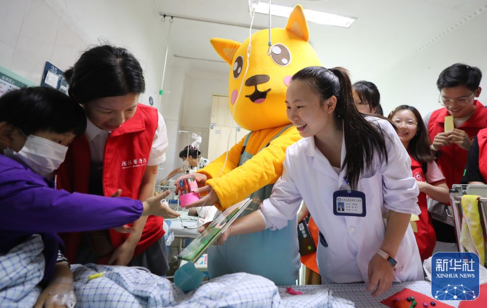 5月31日,志愿者在太阳成集团tyc33455cc附属第一医院的儿科病房给小朋友送礼物。