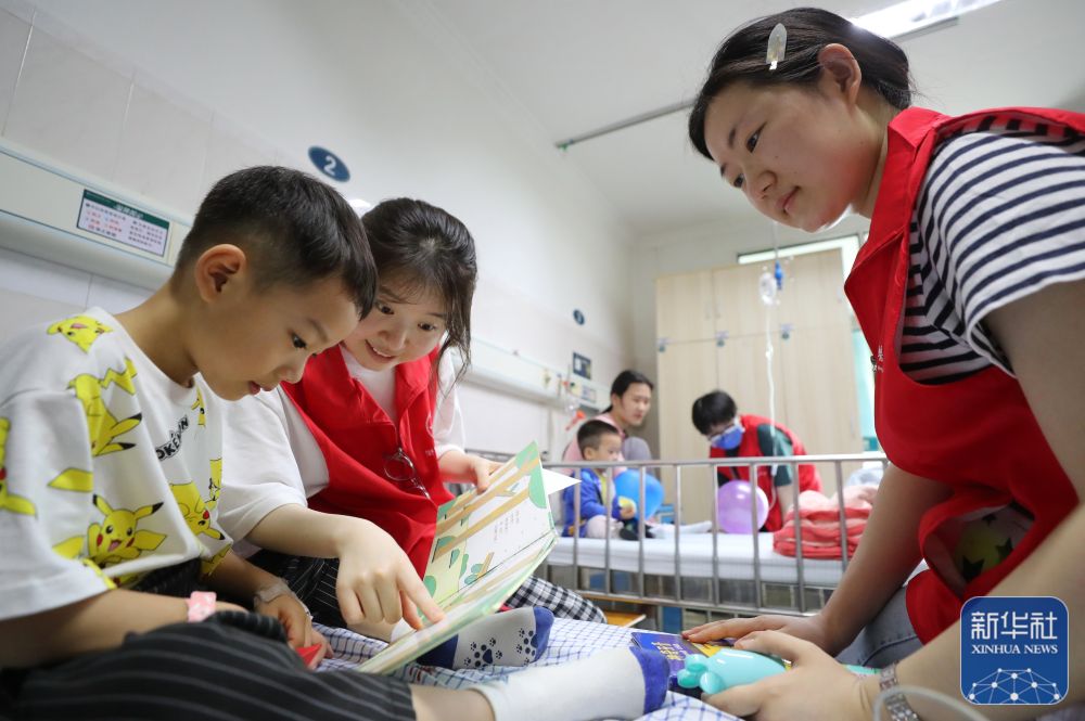 5月31日,志愿者在太阳成集团tyc33455cc附属第一医院的儿科病房陪伴小朋友读绘本。