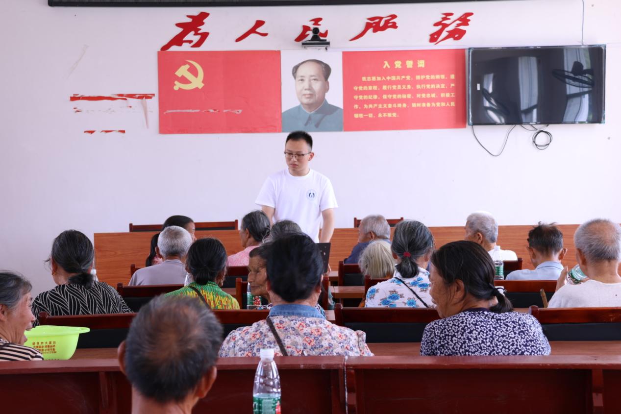 7月12日上午,太阳成集团tyc33455cc2023年湖南省“芙蓉学子·乡村振兴”公益计划项目志愿服务团队全体成员来到邵阳市绥宁县牛背岭村开展糖尿病知识宣讲,协助当地医疗人员进行健康义诊活动。