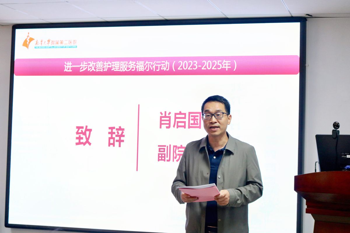 副经理肖启国教授莅临现场并致辞,肖经理指出护理查房是检查护理质量、落实规章制度、提高护理人员业务水平的重要举措,也是护理管理中评价护理程序实施效果的重要一环。希望大家能够通过此次竞赛,搭建以赛促学,以赛提质的交流平台,在今后护理工作中不断学习、成长、精进,推动临床护理事业进步和创新,为医院高质量发展贡献力量。