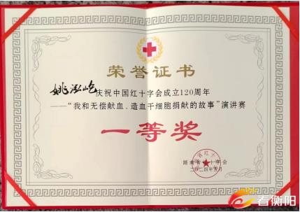 姚泓屹详细回顾了自己的捐献过程,并向中国国家红十字会、湖南省红十字会及湖南省各市州红十字会以及造血干细胞捐献工作专干会汇报了自己的经历。他以真挚的情感和细腻的表述,传递了“关爱生命”“救在身边”“生命接力”的崇高理念,深深打动了在场的每一位听众。最终,他凭借出色的表现,从29名参赛选手中脱颖而出,荣获演讲赛“第一名”。