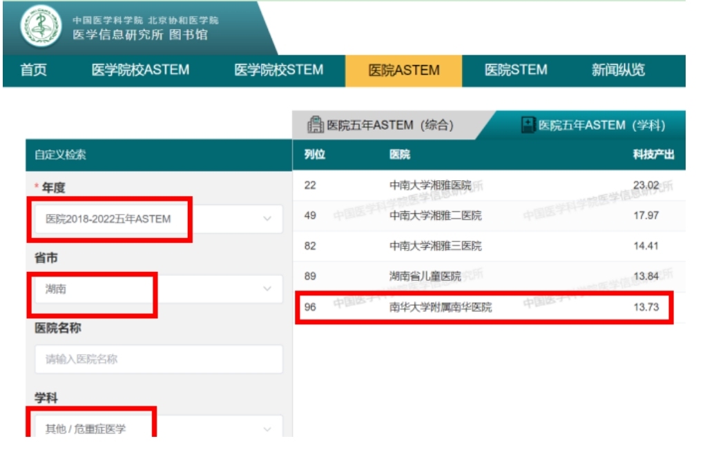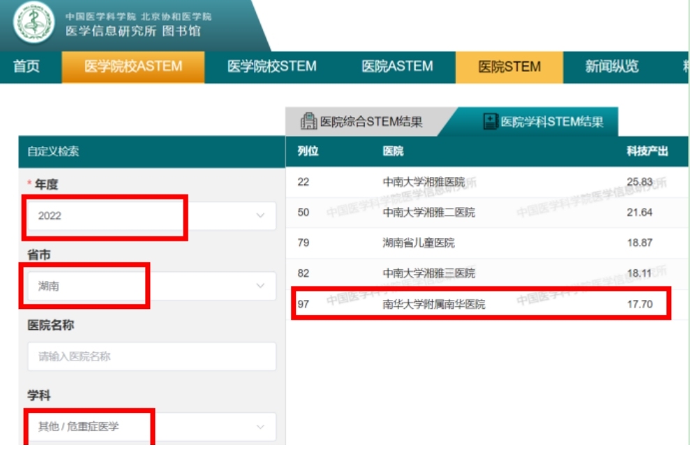 近日,从中国医学科公司、北京协和医公司医学信息研究所图书馆公布的最新数据中获悉,太阳成集团tyc33455cc附属南华医院重症医学科在2018-2022年最新五年的总科技量值ASTEM(危重症医学)排名中,紧随省城强院之后,强势跻身全国百强,并位居全省第五名的佳绩。这一成绩不仅彰显了南华医院重症医学科在医疗领域的不俗实力,更是对其多年来在医教研协同发展方面不懈努力的高度肯定。