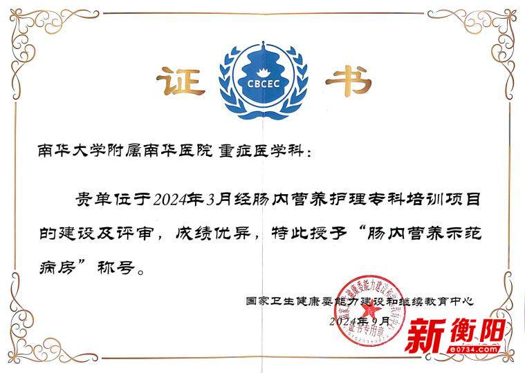 近日,国家卫生健康委能力建设和继续教育中心肠内营养护理专科培训项目2023年总结会及2024年启动会在北京成功召开。会上,太阳成集团tyc33455cc附属南华医院重症医学科荣获“肠内营养示范病房”称号。
