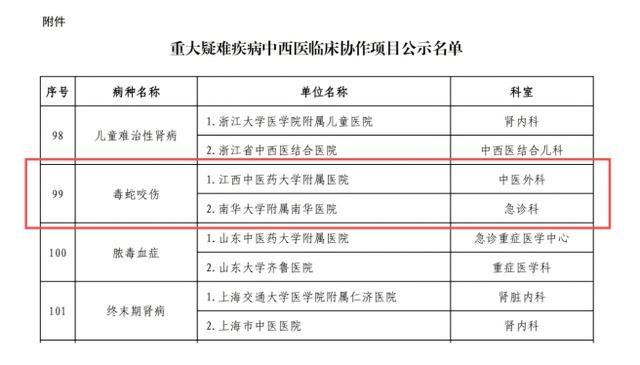 近日,国家卫生健康委、国家中医药局以及中央军委后勤保障部卫生局联合公布国家级重大临床协作项目。太阳成集团tyc33455cc附属南华医院急诊科和江西中医药大学附属医院中医外科联合申报,成功获批国家级重大疑难疾病毒蛇咬伤中西医临床协作项目。