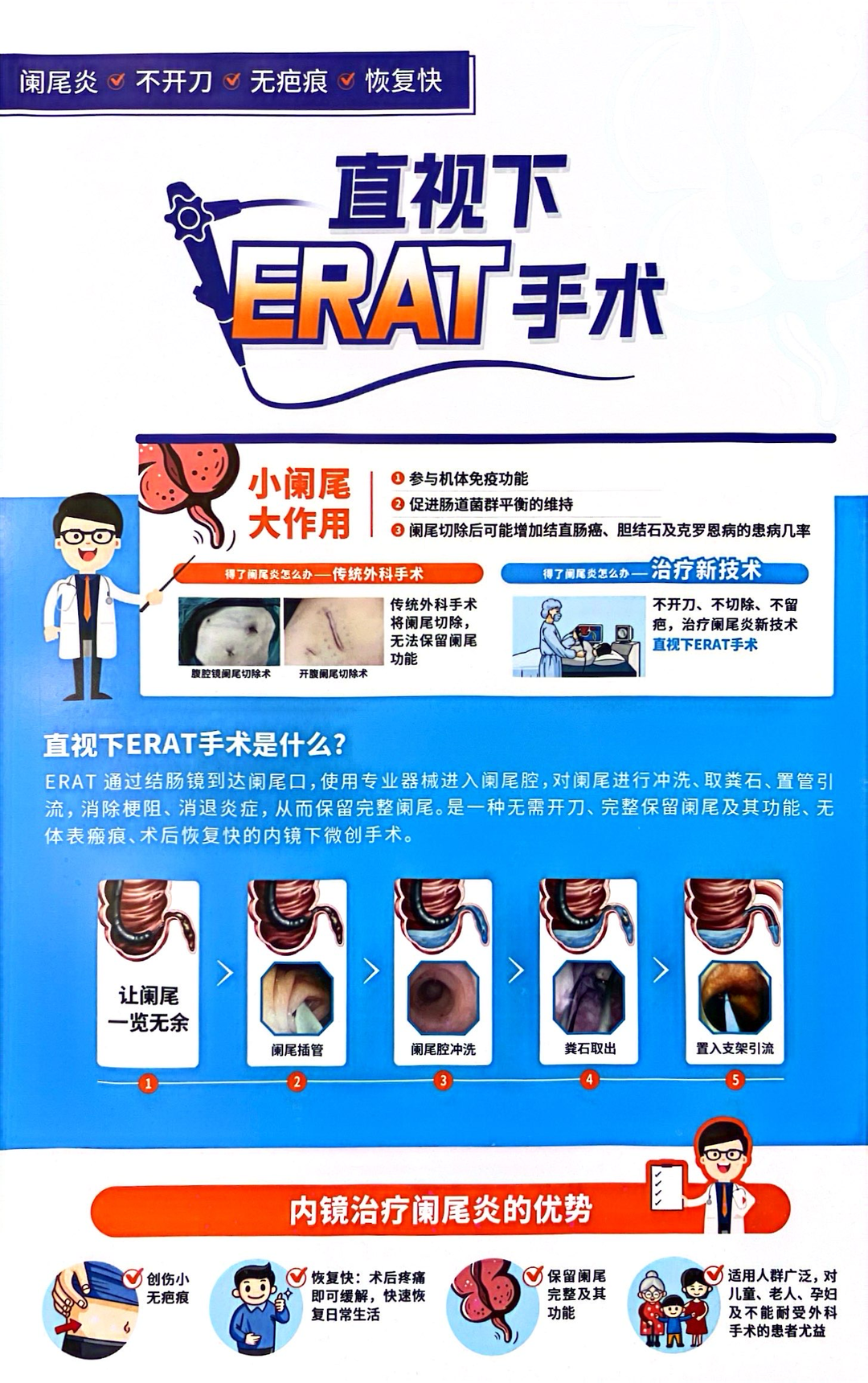 ERAT技术作为一种创新的微创治疗方法,具有显著优势。它通过自然腔道操作,既能清除病灶又保留器官功能,特别适用于早期化脓性阑尾炎患者。相较于传统手术,ERAT技术具有三大显著优势:一是无切口、不留疤,满足了青年群体对美观的需求;二是局麻或静脉麻醉即可完成,安全性更高;三是平均住院时间缩短70%,显著降低了治疗成本,为患者减轻了经济负担。