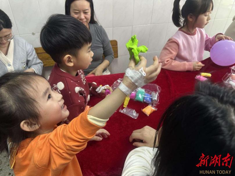 为提升活动效果,志愿者们提前对活动场地进行精心布置,原本普通的输液室被装点得童趣盎然,处处洋溢着活泼欢快的气息。一切准备就绪后,孩子们满怀兴奋与期待进入场地,活动正式开始。手工环节中,孩子们发挥无限创意,用灵巧的小手将普通黏土变幻成各种有趣造型,他们神情专注,如同小小艺术家,完全沉浸于创作天地。志愿者们全程陪伴,细心指导,让每个孩子都能享受创作的乐趣。