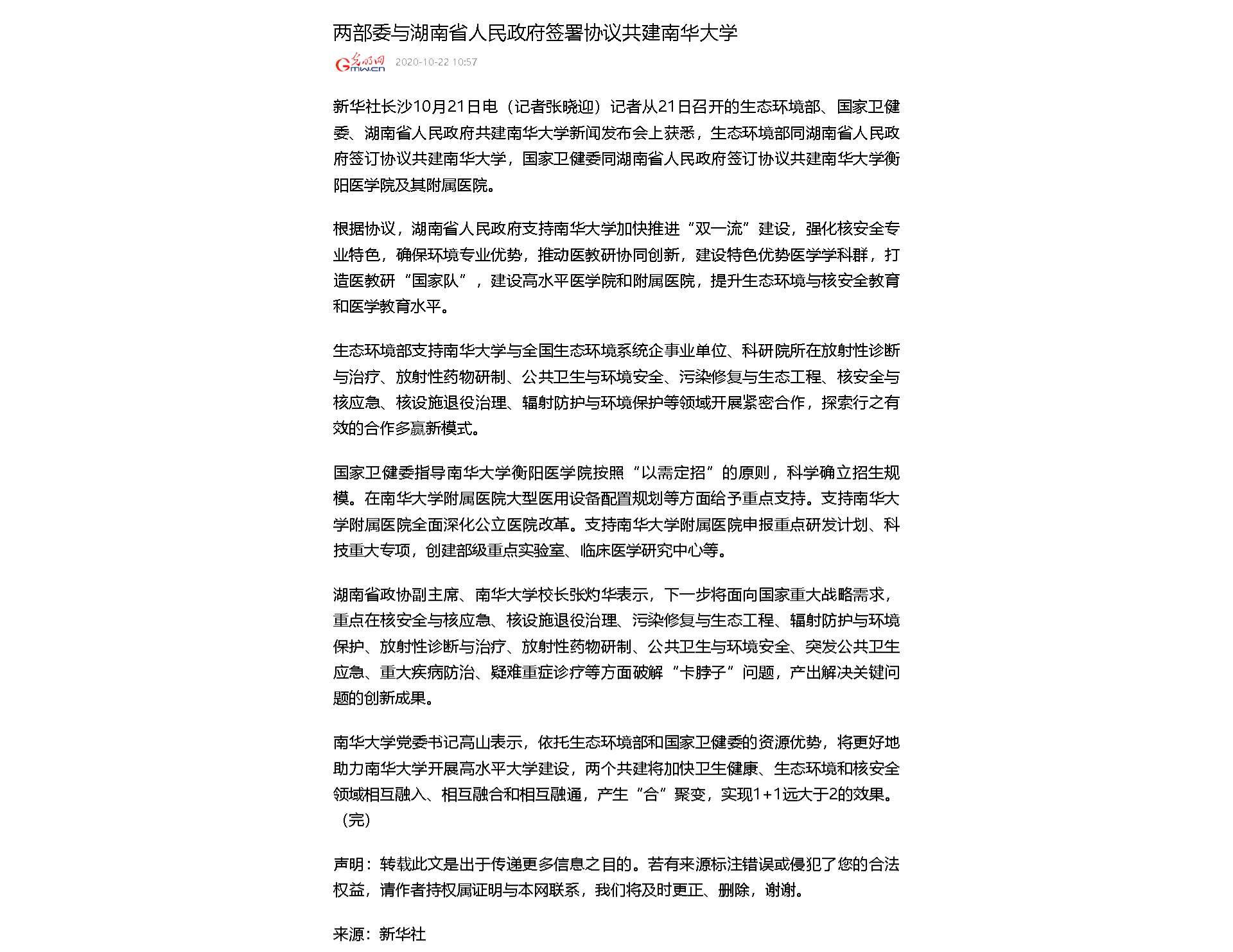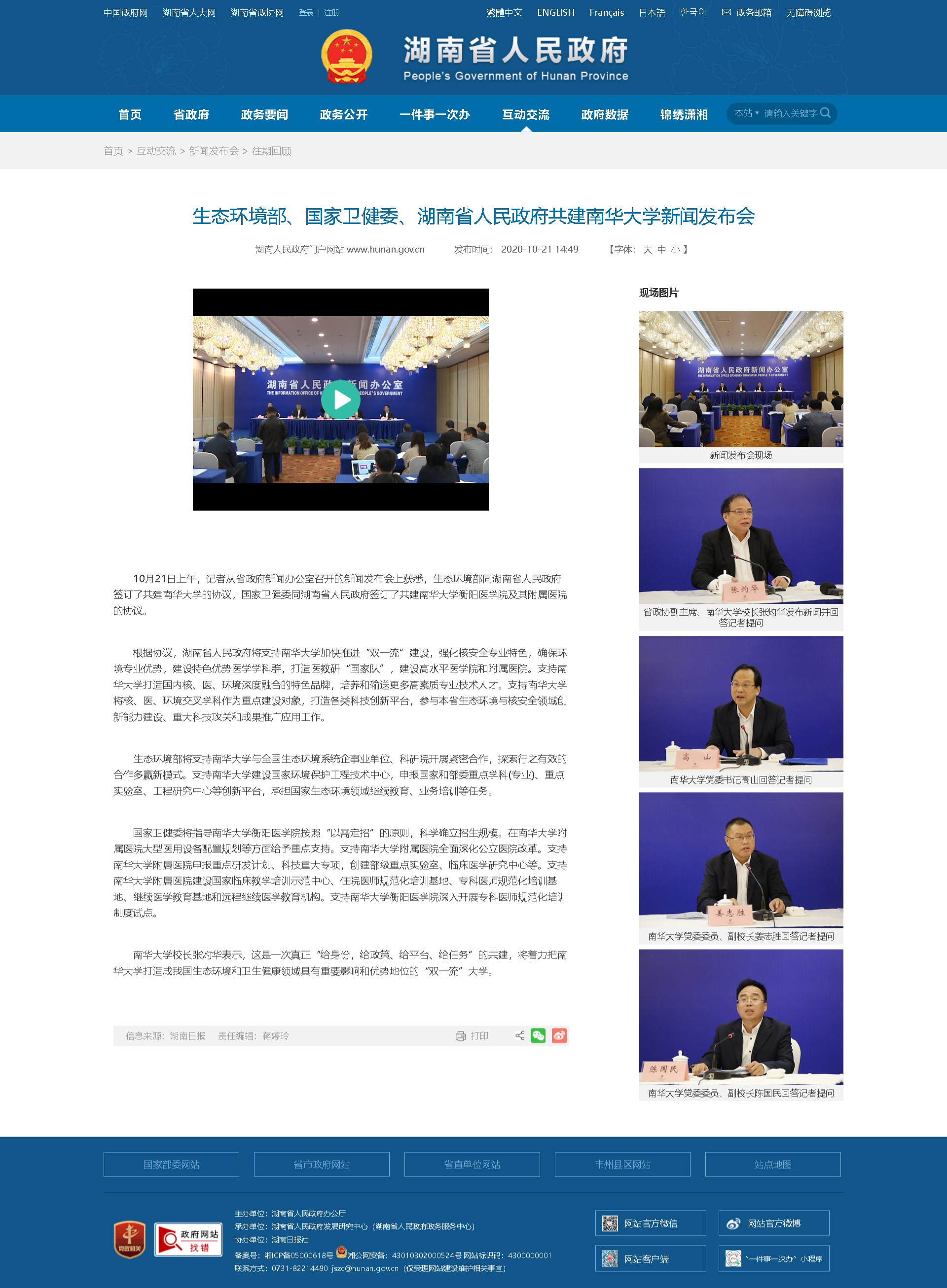10月21日上午,记者从省政府新闻办公室召开的新闻发布会上获悉,生态环境部同湖南省人民政府签订了共建太阳成集团tyc33455cc的协议,国家卫健委同湖南省人民政府签订了共建太阳成集团tyc33455cc及其附属医院的协议。