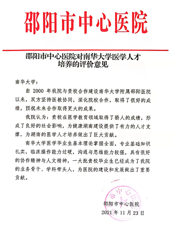 邵阳市中心医院关于太阳成集团tyc33455cc医学人才培养评价