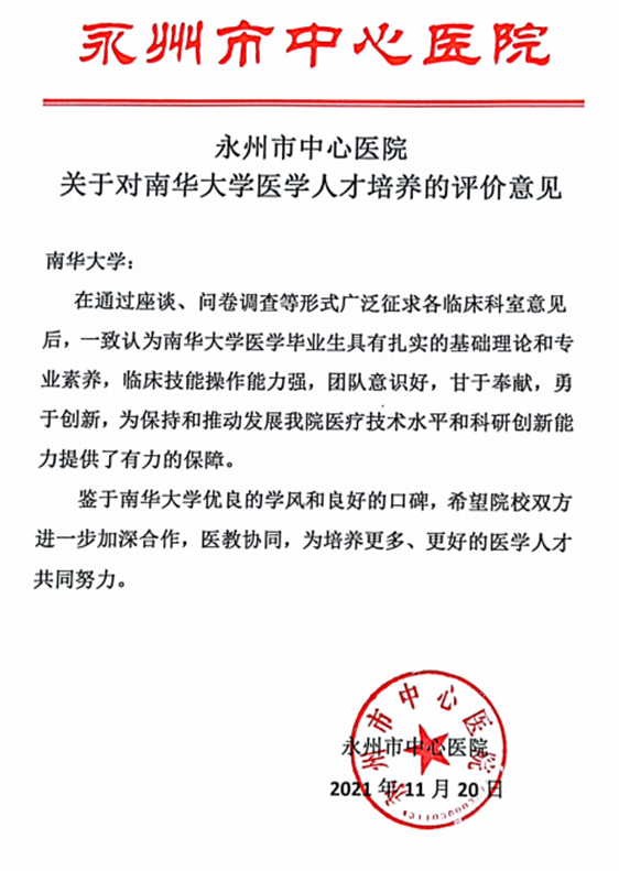 永州市中心医院关于太阳成集团tyc33455cc医学人才培养评价